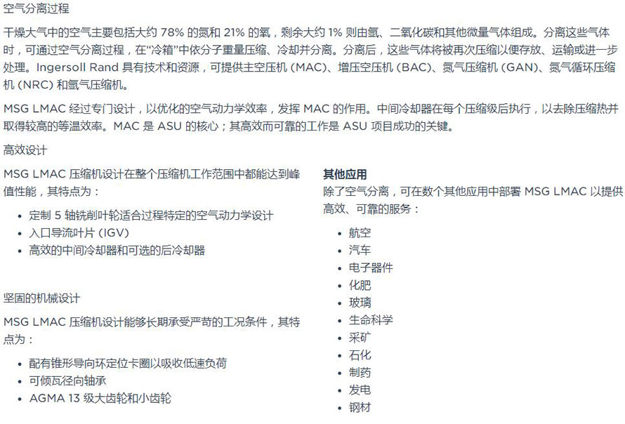 MSG LMAC 是一种集成齿轮离心压缩机,已作为主空压机 (MAC) 针对空气分离装置 (ASU) 上的应用进行了优化。该空压机组旨在简化安装、运行和维护工作,并使全球范围内的安装达到各种设计规章的要求。MSG LMAC 有三种型号,经过空气动力学优化在 ASU 中充当 MAC,产氧量为 150 至 400 吨/天 (TPD)。
