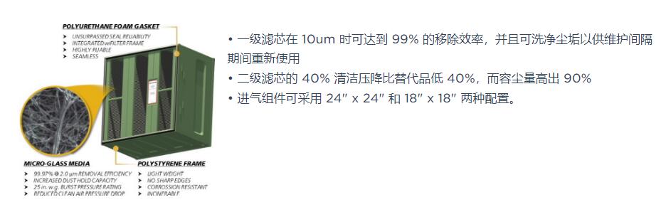 ECO-FILTER™ 进气口过滤系统利用高质量的一级和二级过滤器滤芯,可降低能量成本并使其工作寿命比替代品更长。进气组件可采用 24""x24""和18""x18""两种配置。二级滤芯的清洁压降比替代品低40%,而容尘量高出89%。容尘量高出89%。
